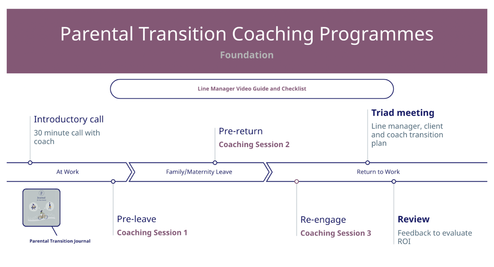 We include our parental transition journal as a bonus resource for our parents as they go on and return from leave. Packed with coaching-led activities this is a useful guide that accompanies them on their journey and complements the work they do in their coaching sessions.